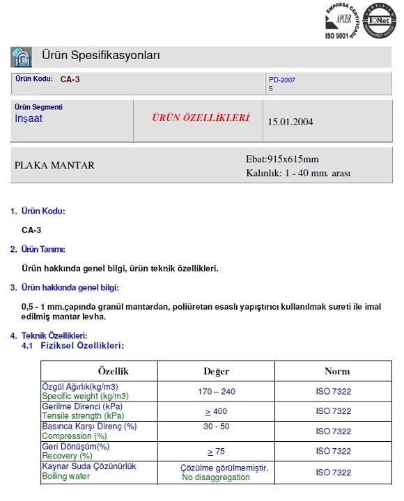 Ürünlerimiz alev yürütmez ve yanmazlık sertifikalarına sahip avrupa normlarında alev almaz / yanmazlık Firex ; yanmazlıkta BS476:class 0 ve Unı 9175:2008 M1 belgelerine sahiptir. Ölü hücreli olması nedeni ile mantar ve bakteri üretmemekte anribakteriyeldir.